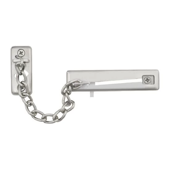 Traditional welded steel link door chain with sturdy cast rail and childproof safety catch, available nickel or gold plated.