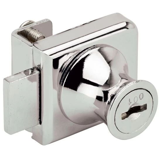 RONIS 31160 Glass Sliding Door Lock is supplied non-mastered in a bright chrome finish. It has 2 x 4mm fixing screws on a `U` shaped plate, designed to fit around the glass edge. The key is inserted and withdrawn in the 12 o’clock position and rotated 90º in either direction to operate the bolt.