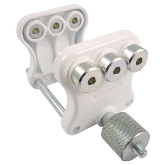 The SASHSTOP Installation Jig is a helpful installation tool for use with the Sashstop product range. It is designed to get a perfect fit for every installation of your sash stopper on UPVC, composite or wooden doors, by attaching the jaws to the frame, using the useful notches to line up.